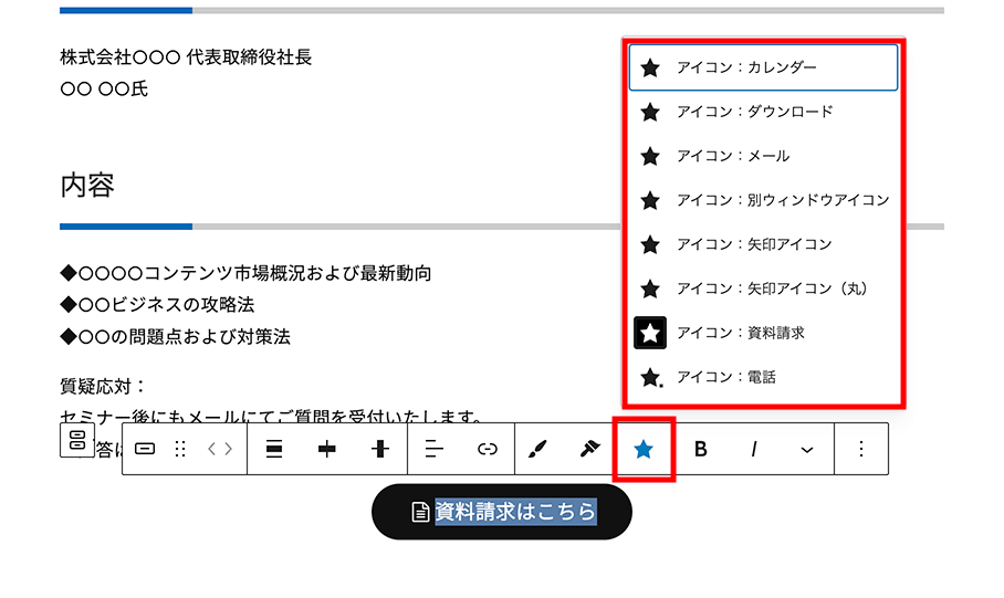 使い方は、アイコンを付けたいテキストを選択し、ツールバーの「★」ボタンからお好みのアイコンを選ぶだけです。