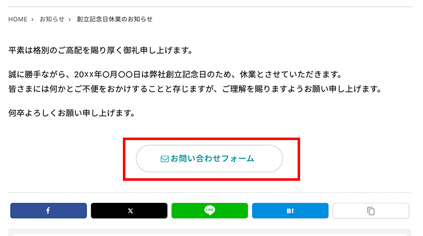 カテゴリーごとに自動で設置していたボタンやバナー(例:お知らせ投稿の末尾に表示されるお問い合わせフォームボタンなど)につきましては、今回の変更により削除となります。